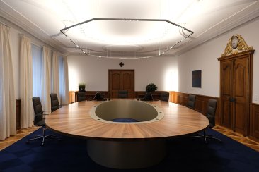 Mittelpunkt des Raumes ist ein Konferenztisch von eindrucksvoller Grösse, an welchem die Regierung tagt und ihre Gäste empfängt. Der Tisch in Form einer Ellipse liegt auf einem schlanken, konischen Sockel, in welchem modernste AV-Technik platzsparend eingebaut ist. Die grosszügig bemessene Tischfläche erhielt dadurch eine gewisse Leichtigkeit und bietet optimale Beinfreiheit. Das Nussbaumholz passt zu den Türen und der Täfelung des barocken Saales ebenso wie zu den vorhandenen Beistelltischen.
