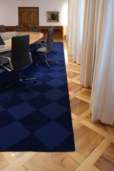 Die geschlossene Innenfläche des Sockels sorgt für optische Ruhe. Sie ist metallic-seidenglanzlackiert und harmoniert farblich mit dem lebhaften Luzern-Blau des Teppichs. Bei diesem wurden die Wollfäden abwechselnd getuftet oder geknotet, wodurch ein diagonales Schachbrettmuster entstand, inspiriert vom antiken Parkett.